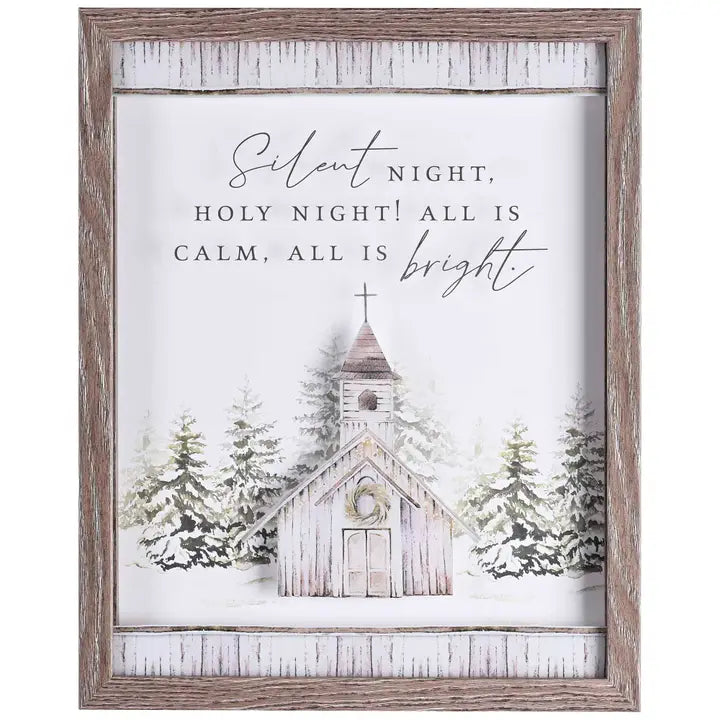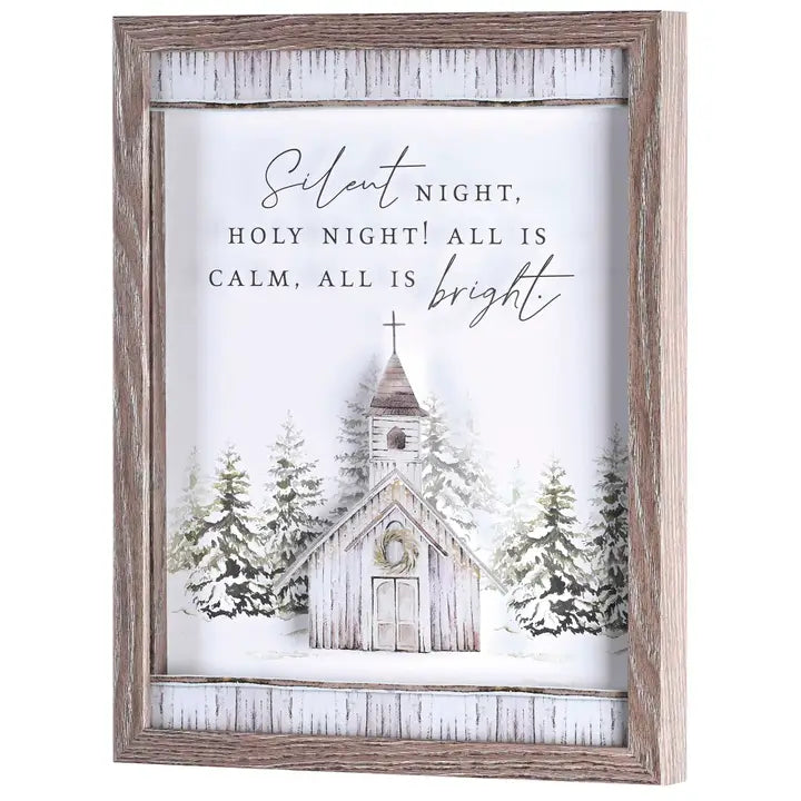 Features A Country Church In The Snow, With Wood-Look Top and Bottom Borders. Art Features Text: Silent Night, Holy Night! All Is Calm, All Is Bright. The Church And Text Are Printed On The Underside Of Glass That Sits 3/4 Above A Snow/Tree Background. Woodgrain Frame Is MDF Wood. Print/Glass Size Is 11 x 14; Outer Frame Size Is 12 x 15. Removable Back Includes Pull-Out Easel Plus Hanging Hooks for Either Tabletop or Wall Display. Assembled in the US of imported materials.
