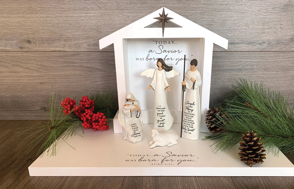 This Holy Family Set Includes 3 Beautiful Sculptured Pieces that tell The Story of the Birth of Jesus and One Lamb. Each person in the set has a verse that shares their part of The Christmas Story. Today In the Town of David A Savior has been Born. He is The Messiah! He is The Lord! This Christmas, Cherish the sweetness and celebrate The Majesty of where it all began, The Birth of Christ.
