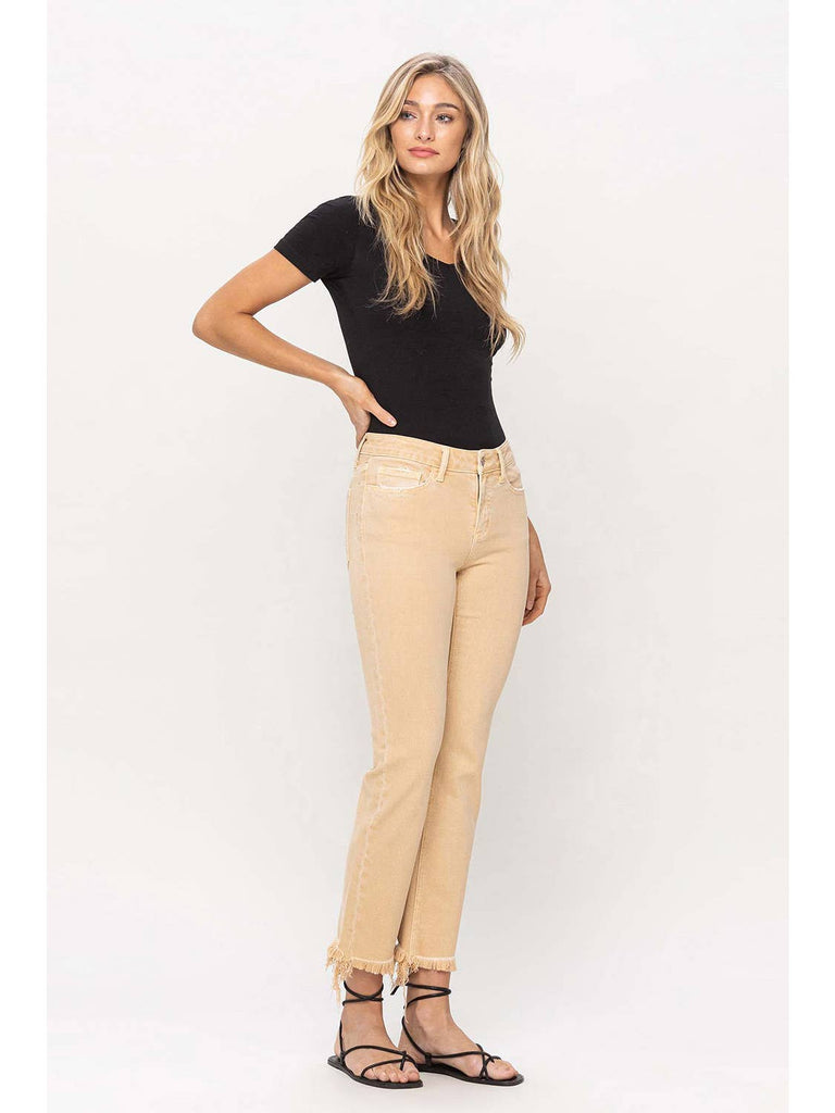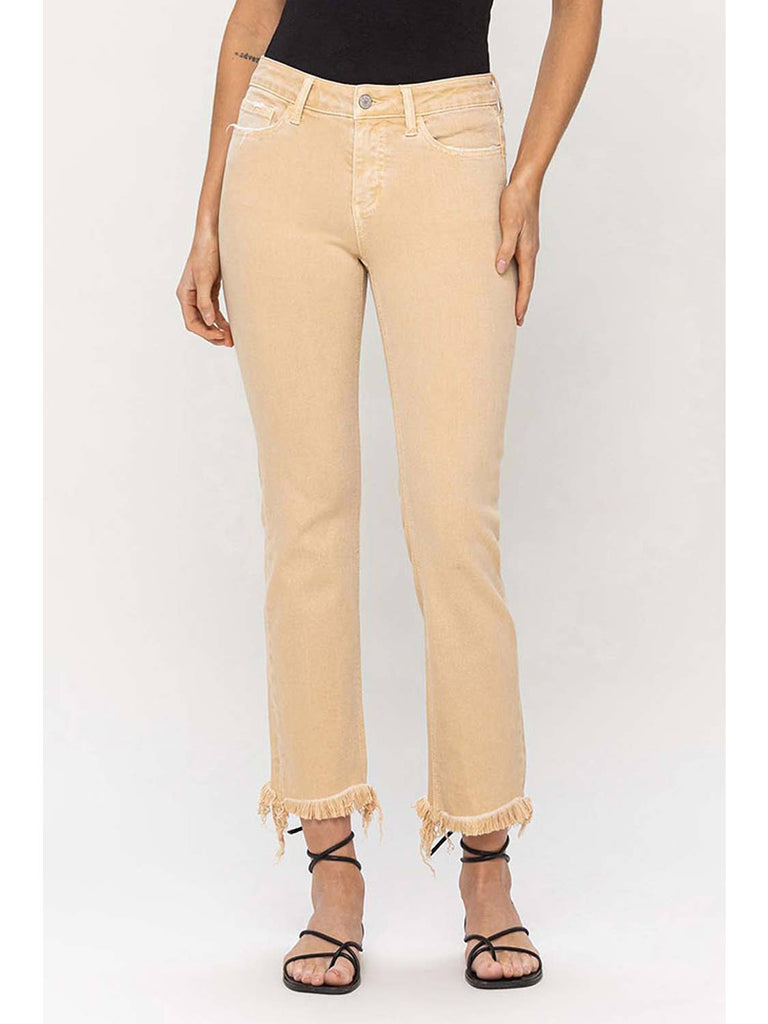 MID RISE STRAIGHT JEANS COMFORT STRETCH COLOR DENIM, MID RISE WAIST, FRAYED HEM, CROPPED LENGTH, STRAIGHT JEANS F. RISE: 9" / INSEAM: 27'' / LEG OPENING: 14''