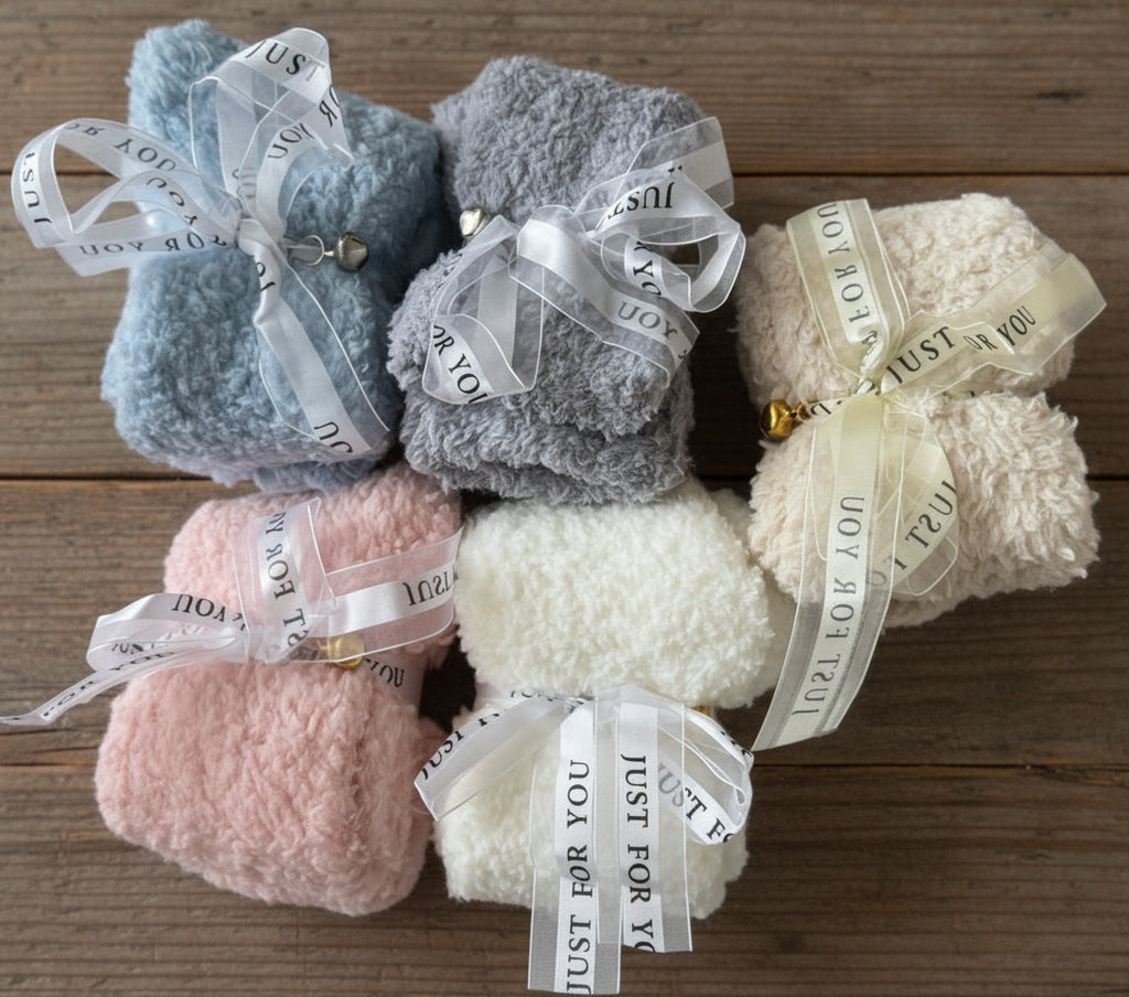 These cozy fuzzy crew-length socks are the perfect way to warm up your loved ones. Soft and squishy, these blue-, pink-, grey- and ivory-colored socks feature a gold jingle bell to get you in the holiday spirit.                                                                                                              FEATURES:                                                                                                                                        ❄️SIZE: US size that fits shoe sizes from US 5 to 9.                                                                      ❄️Soft warm material wrapped and ready to give                                                                      ❄️Includes "Just for you" ribbon and jingle bell                                                                          ❄️Makes the perfect stocking stuffer or small gift